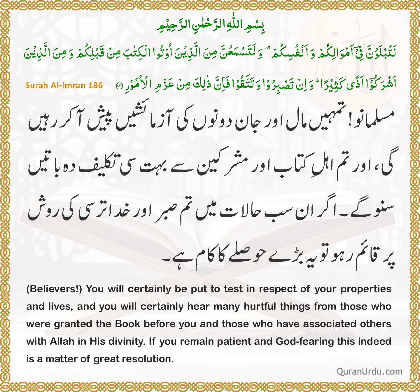 Today’s Quran and Hadith Surah Al-Imran – Ayah 186 Surah Al-Imran – Ayah 186 Jamia Tirmizi – 2417 Jamia Tirmizi – 2417