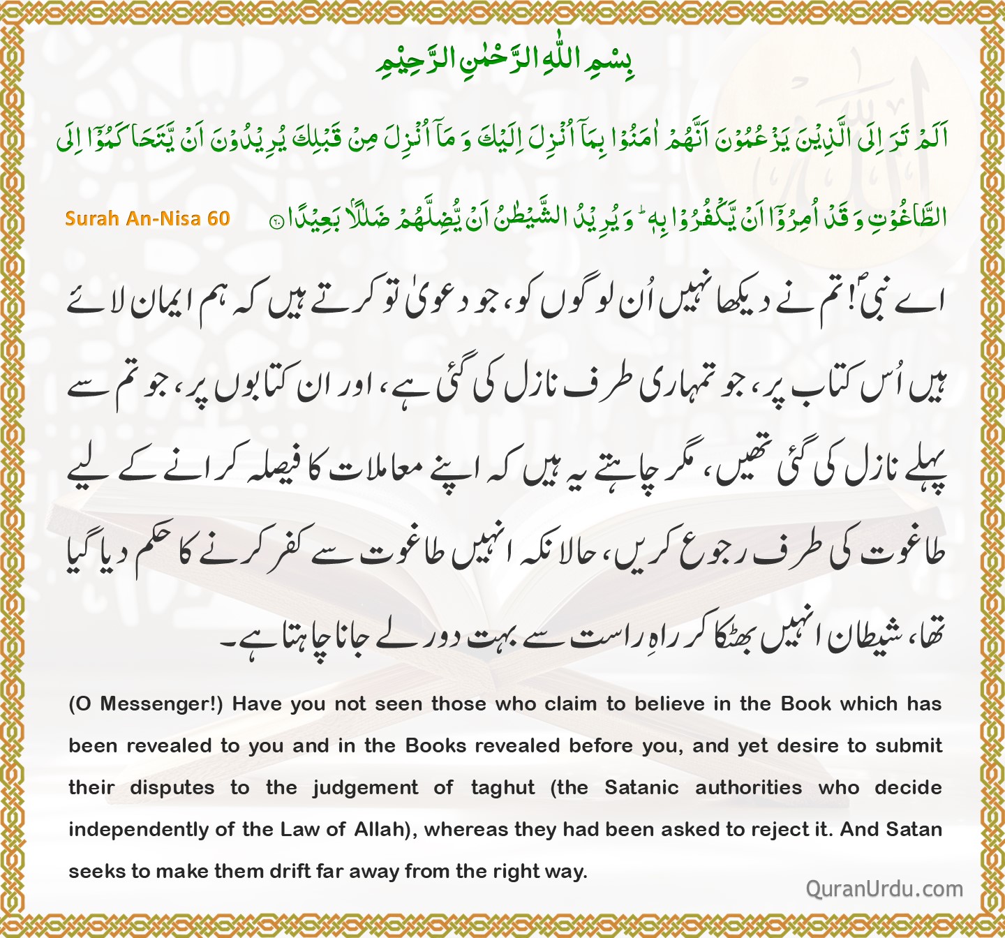 Today’s Quran and Hadith Surah An-Nisa – Ayah 60 Surah An-Nisa – Ayah 60 Sahih Muslim – 6808 Sahih Muslim – 6808